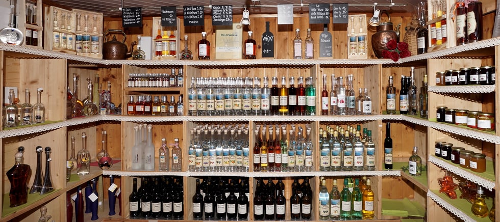 Bei uns im Verkaufsladen finden Sie all unseren gebrannten Destillate, Geschenkverpackungen, mundgeblasene Flaschen sowie feinste und selbst hergestellte Hofprodukte.